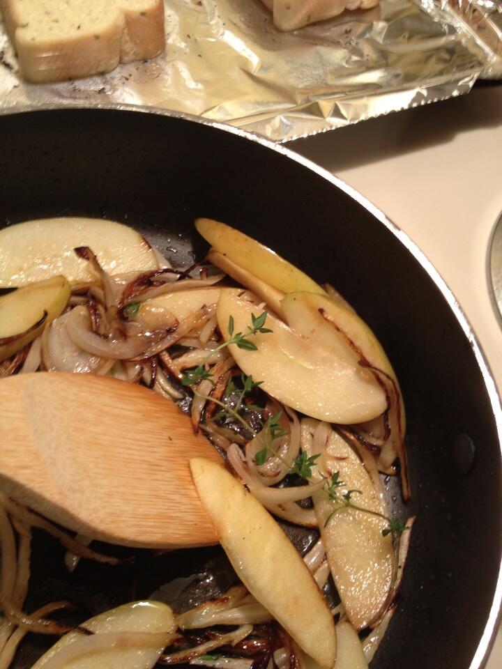 3. Toss in the thyme sprigs (or dried) and stir. Push the apples & onions to the sides.